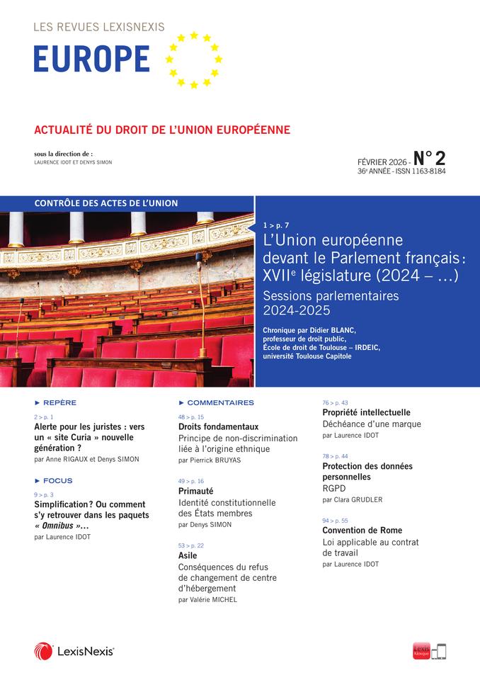Le mensuel du droit de l’Union européenne L’actualité du droit de l’Union européenne est suivie au plus près à travers des études, analyses des principaux textes adoptés par les institutions de l’Union européenne, de la jurisprudence de la Cour de justice et du Tribunal, et de leurs répercussions au niveau national. Direction scientifique : Laurence Idot et Denys Simon