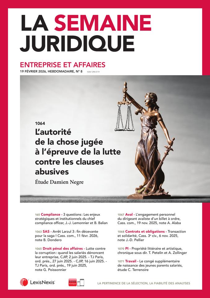 N° 1, janvier-février 2026, LexisNexis Le repère du professeur Michel Menjucq porte sur « L’opposabilité de la clause d’arbitrage au liquidateur judiciaire » à la suite d’un arrêt de la cour d’appel...